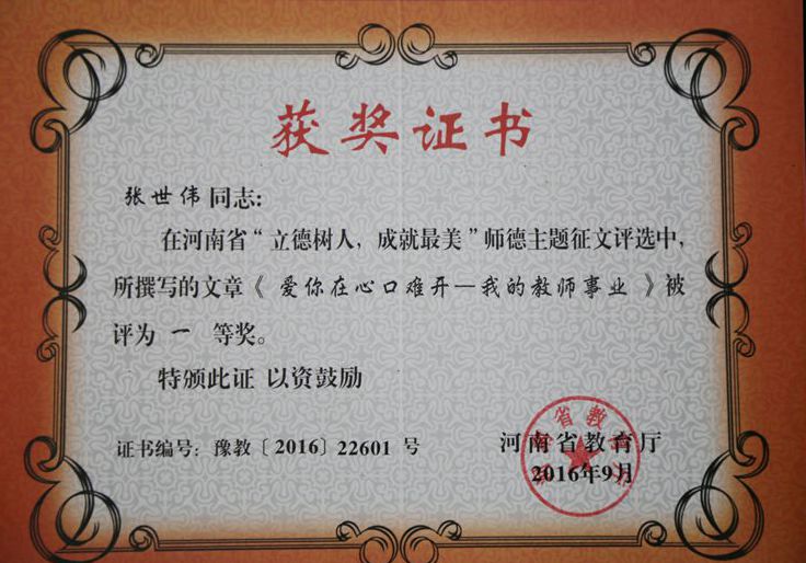 9月27日,河南省教育厅下发了《关于公布“立德树人,成就最美”师德师风案例征文评选和演讲比赛结果的通知》(教师〔2016〕752号),我校张世伟老师撰写的文章《爱你在心口难开——我的教师事业》荣获一等奖,王武老师撰写的文章《老师,我要和您一起去看海》荣获二等奖,张学燕老师撰写的文章《继承传统文化立足校园文化注入高校师德建设新内容》荣获三等奖。