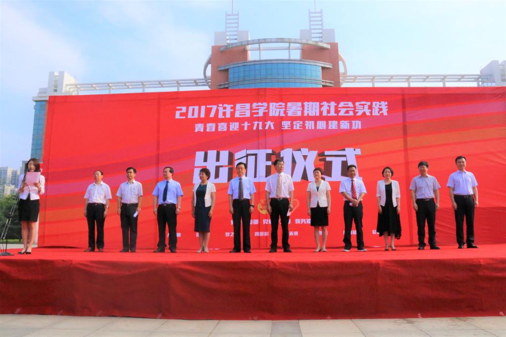 6月29日上午8点,我校2017年“青春喜迎十九大·坚定初心建新功”大学生暑期社会实践活动出征仪式在弘毅广场举行。院长赵继红,党委副书记马超、孙海,纪委书记罗凤英,副院长黄怡俐、郭涛,许昌团市委书记陈涛等出席仪式。河南大森机电股份有限公司董事长赵晓东、河南瑞贝卡发制品股份有限公司人力资源部部长陈玲杰、许昌蓝天救援队队长蒋耀军作为我校大学生社会实践活动合作单位代表莅临现场。各二级学院党总支书记、副书记、团总支书记,实践团队指导老师和社会实践学生代表近1200人参加仪式。出征仪式由团委书记谢依楠主持。