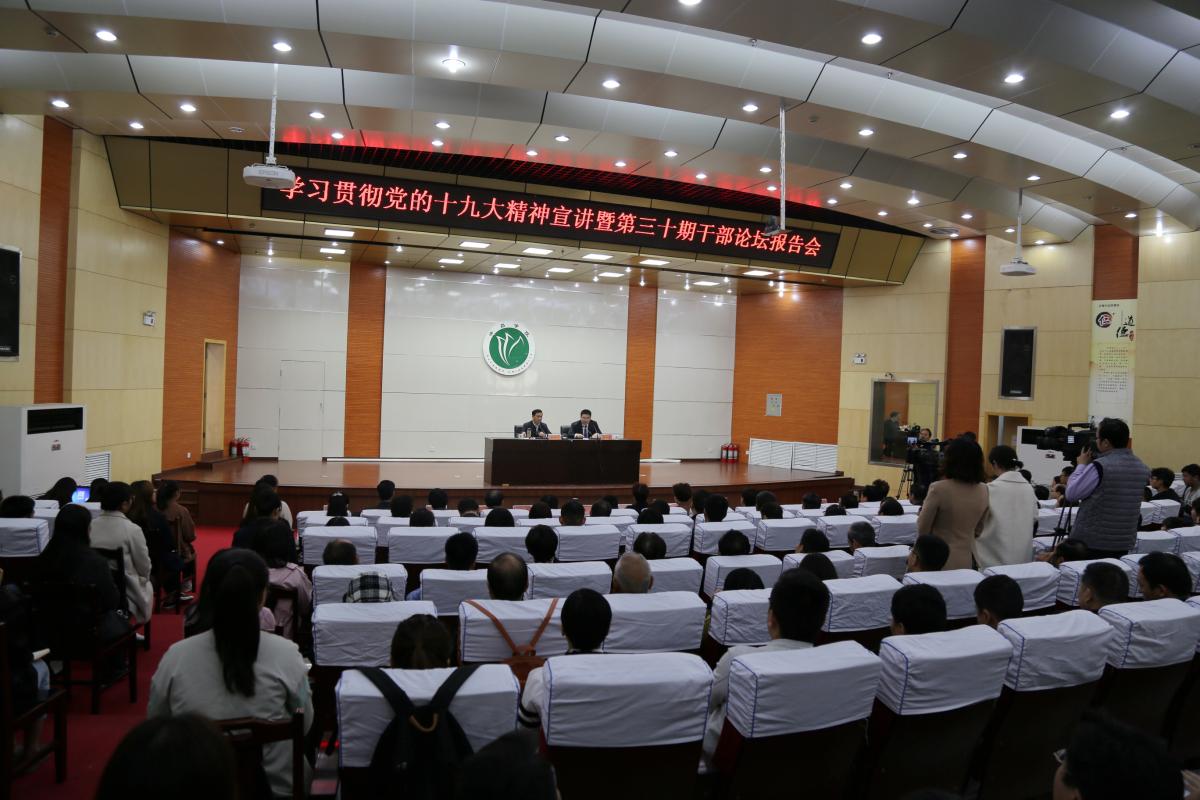11月10日,十九大代表、许昌市委书记武国定做客我校第三十期干部论坛,向广大师生宣讲党的十九大精神。市委常委、市委秘书长王志宏,副市长赵淑红等出席报告会,我校党委书记闫纪建、院长赵继红等全体校级领导干部、全体中层干部,博士、教授、学生代表聆听了武国定书记的精彩报告。报告会由校党委书记闫纪建主持。