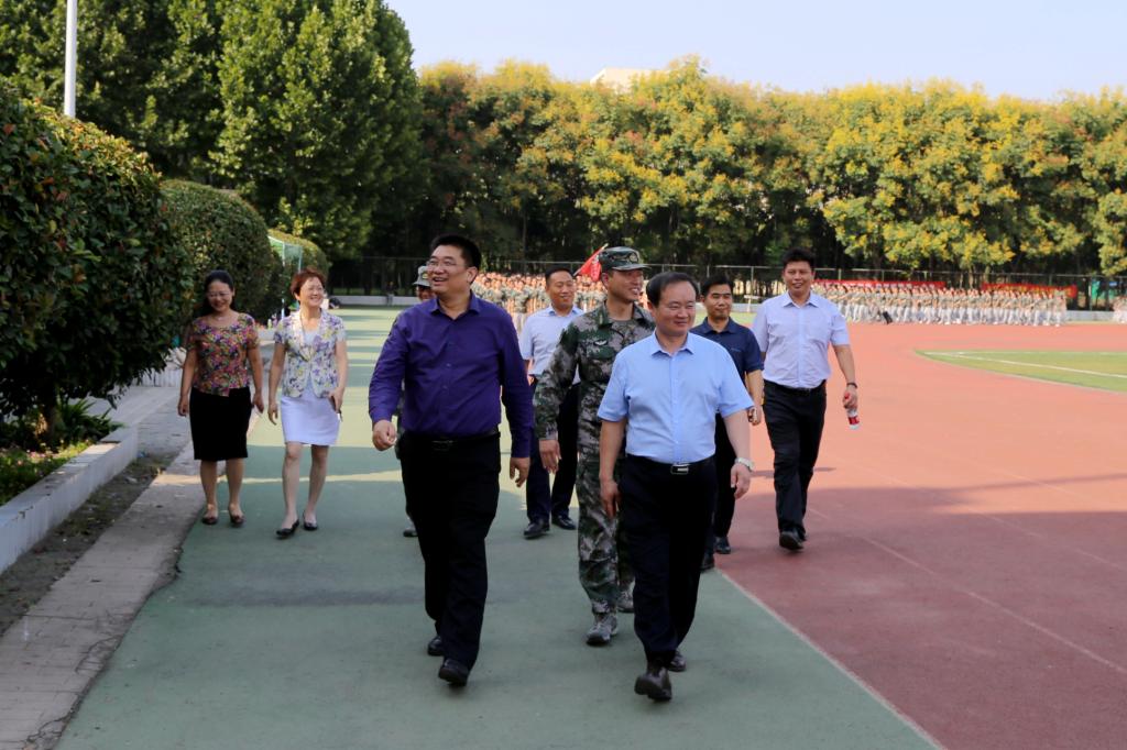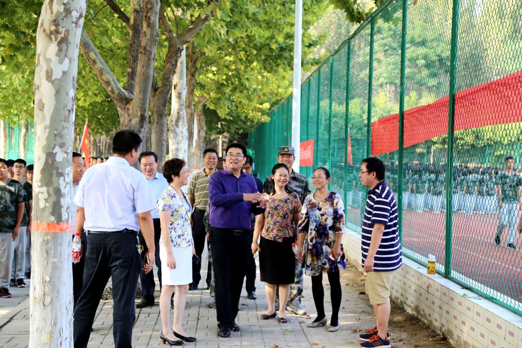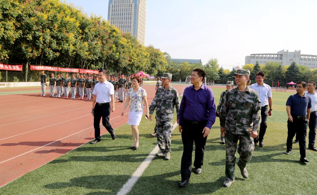 9月18日下午,党委书记闫纪建、院长赵继红、副院长郭涛在承训部队现场负责同志和党政办公室、党委宣传部、学生工作部(处)、保卫处(人武部)等相关部门负责人的陪同下来到新生军训现场,视察我校2017级新生军训情况。