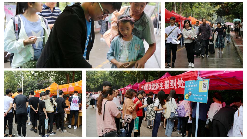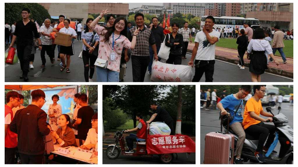 校学生会、青年志愿者协会等团学组织400多名学生志愿者参与到迎新工作中,并在报到期间提供40余辆“爱心行李车”和100把雨伞为新生服务。校内多个地方都设有服务站点,校外的高铁站、火车站、汽车站也都有穿着红马甲的志愿者有条不紊负责接待。小石器们一下车几乎就没有机会再拎起自家行李,前呼后拥被热情的师哥师姐们马上“一抢而空”扛在肩头。