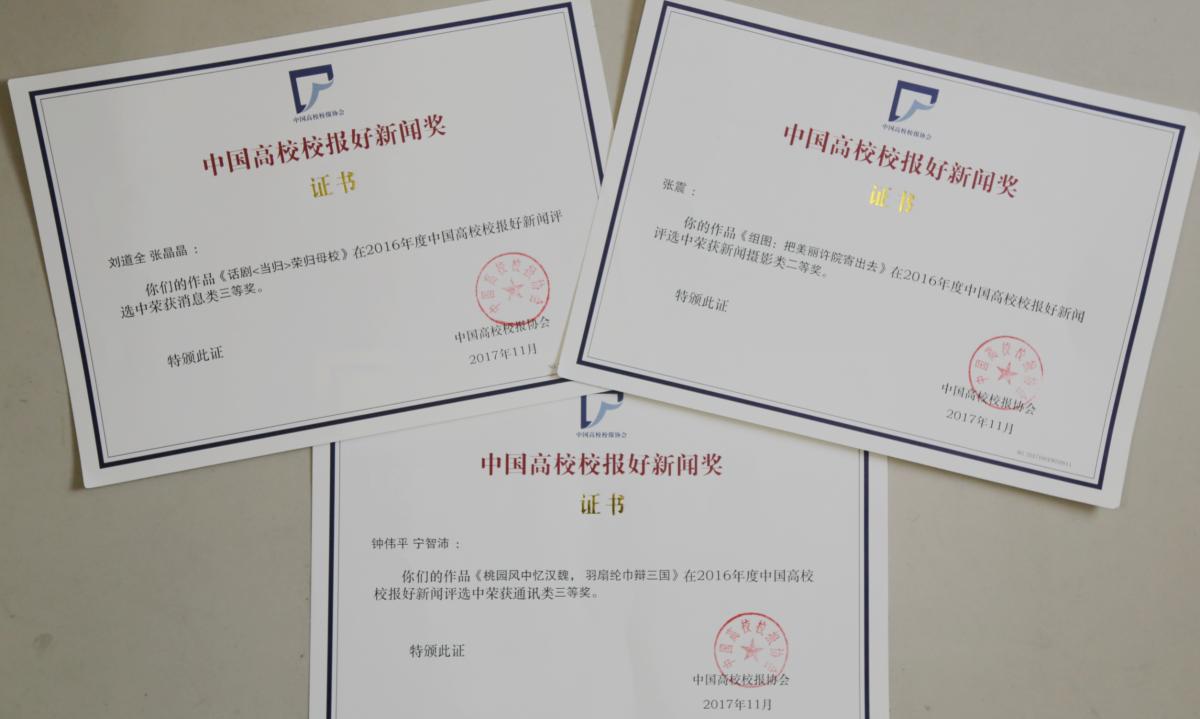 会上公布并评点了2016年度全国高校新闻获奖情况。我校党委宣传部(新闻中心、校报编辑部)报送的作品《话剧<当归>荣归母校》(刘道全 张晶晶)、《桃园风中忆汉魏 羽扇纶巾辩三国》(钟伟平 宁智沛)和《把美丽许院寄出去》(宁智沛 张震等)分别荣获消息类三等奖、通讯类三等奖和新闻摄影二等奖。