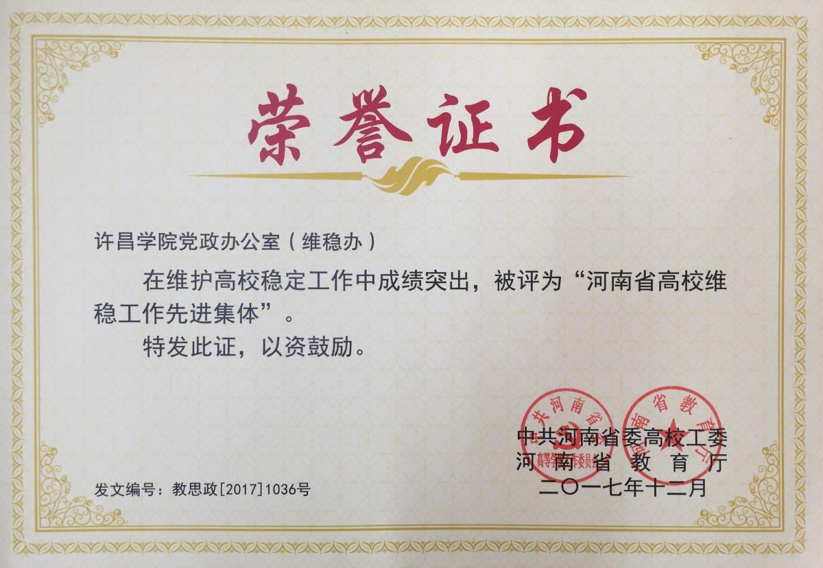近日,河南省委高校工委、河南省教育厅联合下发《中共河南省委高校工委 河南省教育厅关于表彰全省高校维稳工作先进集体和先进个人的通知》,我校党政办公室(维稳办)荣获“河南省高校维稳工作先进集体”荣誉称号,党委保卫部张谦智,党政办公室(维稳办)崔越、王光星获得“河南省高校维稳工作先进个人”荣誉称号。