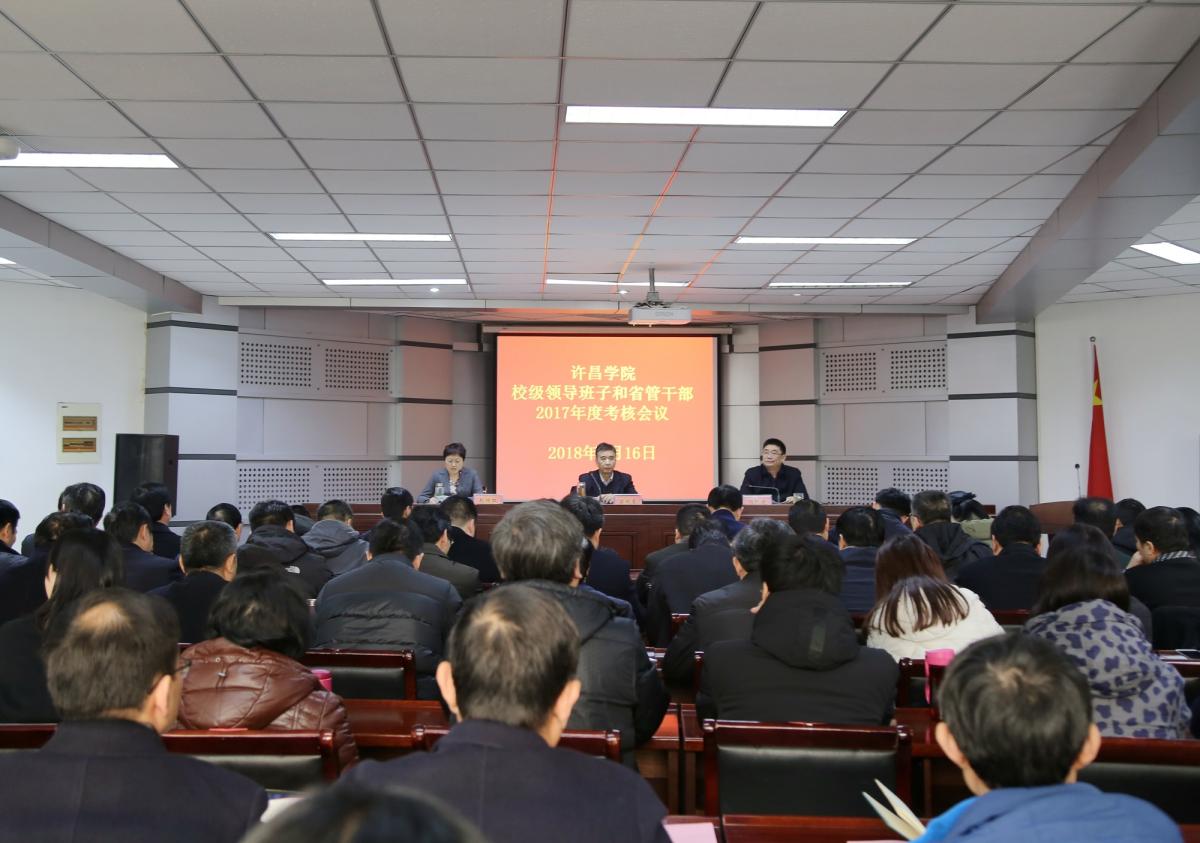 根据省委组织部、省委高校工委统一安排,省委第五考核组一行8人在组长郑州航空工业管理学院原党委书记梁晓夏的带领下,到我校对领导班子和省管干部开展2017年度综合考核。1月16日下午,校级领导班子和省管干部2017年度考核会议在办公楼第三会议室召开。全体校领导、党委委员,纪委委员,学校中层正职,教师、学生代表等103人参加会议。考核会议由院长、党委副书记赵继红主持。