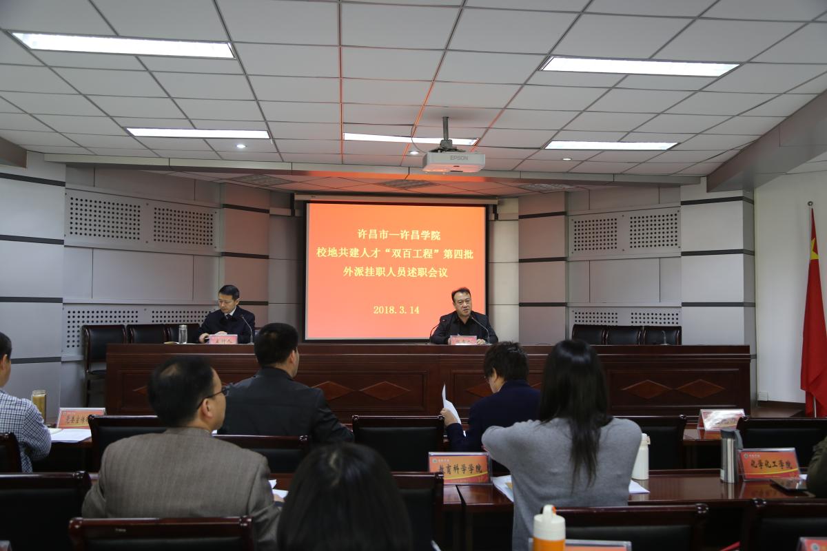 3月14日,许昌市-许昌学院校地共建人才“双百工程”第四批外派挂职人员述职会议在办公楼第三会议室召开。许昌学院纪委书记罗凤英、许昌市委组织部人才工作科科长黄海军出席会议,校党委组织部、党委宣传部、教务处、科技处、人事处、学科建设办公室、校地合作办公室等职能部门负责人,“双百工程”第四批外派挂职人员所在单位负责人,作为述职考核评委参加会议。“双百工程”第五批20名拟外派挂职人员也参加了述职会。会议由我校党委组织部部长陈遂德主持。