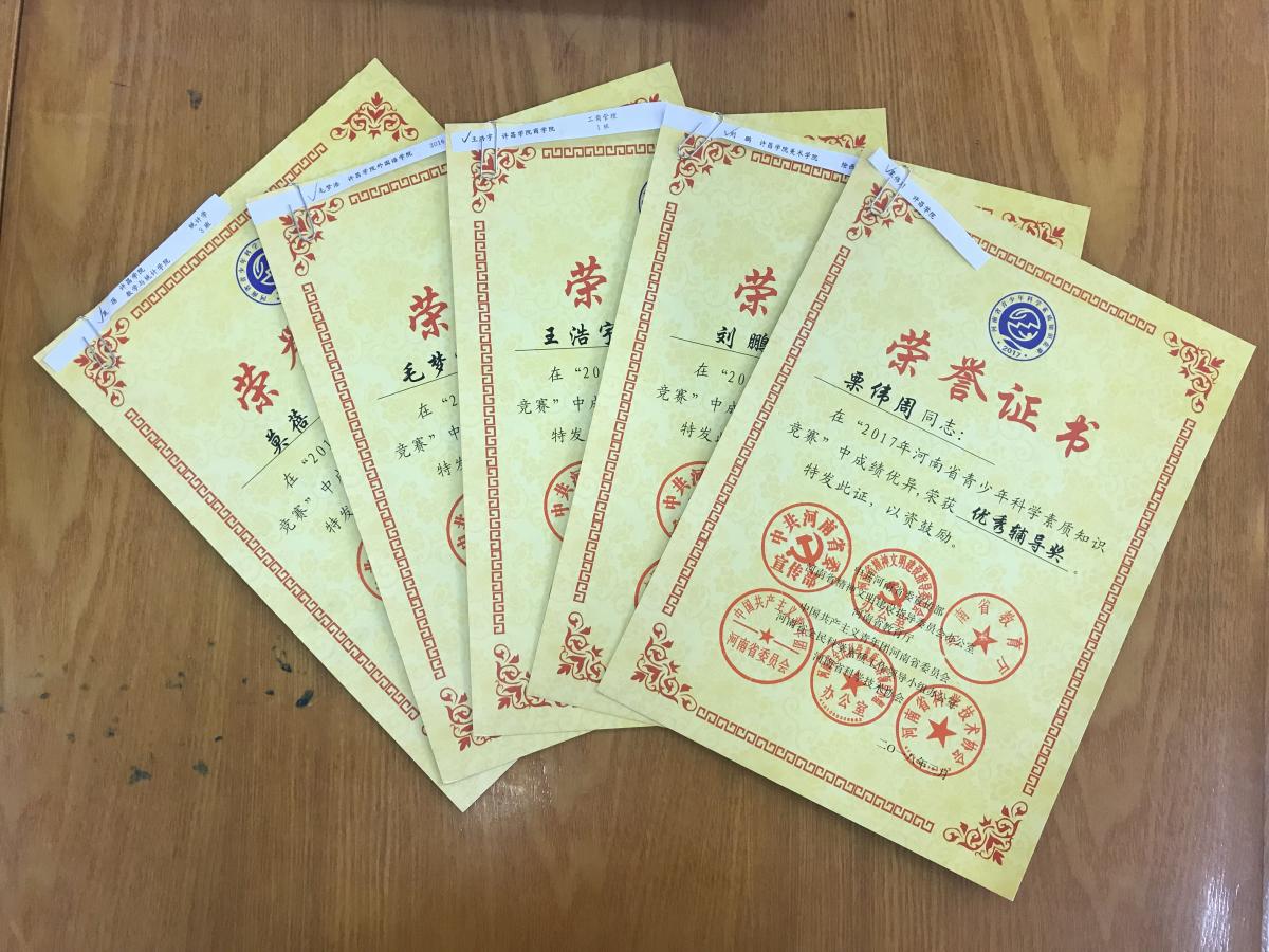 近日,由河南省委宣传部、省文明办、省教育厅、共青团河南省委等联合主办的“2017年河南省青少年科学素质知识竞赛”活动成功举办。来自全省167万名选手参加比赛,我校派出4名同学参加比赛并获得一等奖1项、二等奖2项、三等奖1项。