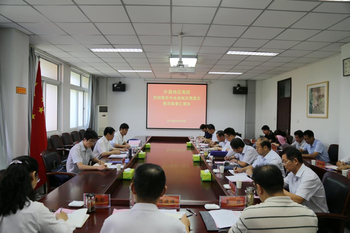 8月20日上午,许昌地区高校贯彻落实中央巡视反馈意见整改督查汇报会在我校召开。省落实中央巡视反馈意见整改第三督查组在原河南理工大学党委书记王少安带领下出席会议。许昌学院、许昌职业技术学院、许昌电气职业学院、许昌陶瓷职业学院四所高校党委书记、副书记和相关职能部门及个别二级学院党总支书记参加了汇报会。汇报会由我校副院长崔斌主持。
