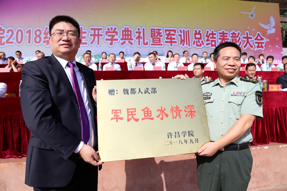 仪式上,闫纪建书记代表我校向魏都区武装部赠送了“军民鱼水情深”的纪念牌。