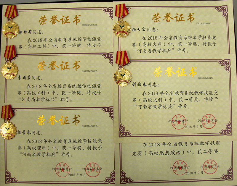 近日,从省教育厅、省教科文卫体工会传来喜讯,在2018年度河南省教学技能竞赛中,我校教师杨天宏、刘临春、李娟芳、徐静莉、殷学永等5人获得一等奖,并被授予“河南省教学标兵”称号;宋昕睿、慕旗娟、江雪、高雪丽、毕翼飞、郭卫芸、鞠志宇等7人获得二等奖,李丽慧获得三等奖。