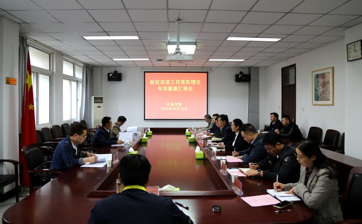 督查组组长、省教育厅学生处副处长周辉强调了教育脱贫攻坚工作的重要意义和基本要求,介绍了我省教育脱贫攻坚工作情况以及此次检查的目的、程序。会上,高金星主席汇报了我校的脱贫任务基本情况、主体责任落实和实际工作的开展情况。他详细介绍了校内贫困学生资助、校地结对帮扶工作和第一书记驻村帮扶工作的开展情况和成效。高主席说,学校将按照督查组的要求,突出重点,积极整改,进一步推进我校教育脱贫攻坚工作规范化和精准化。