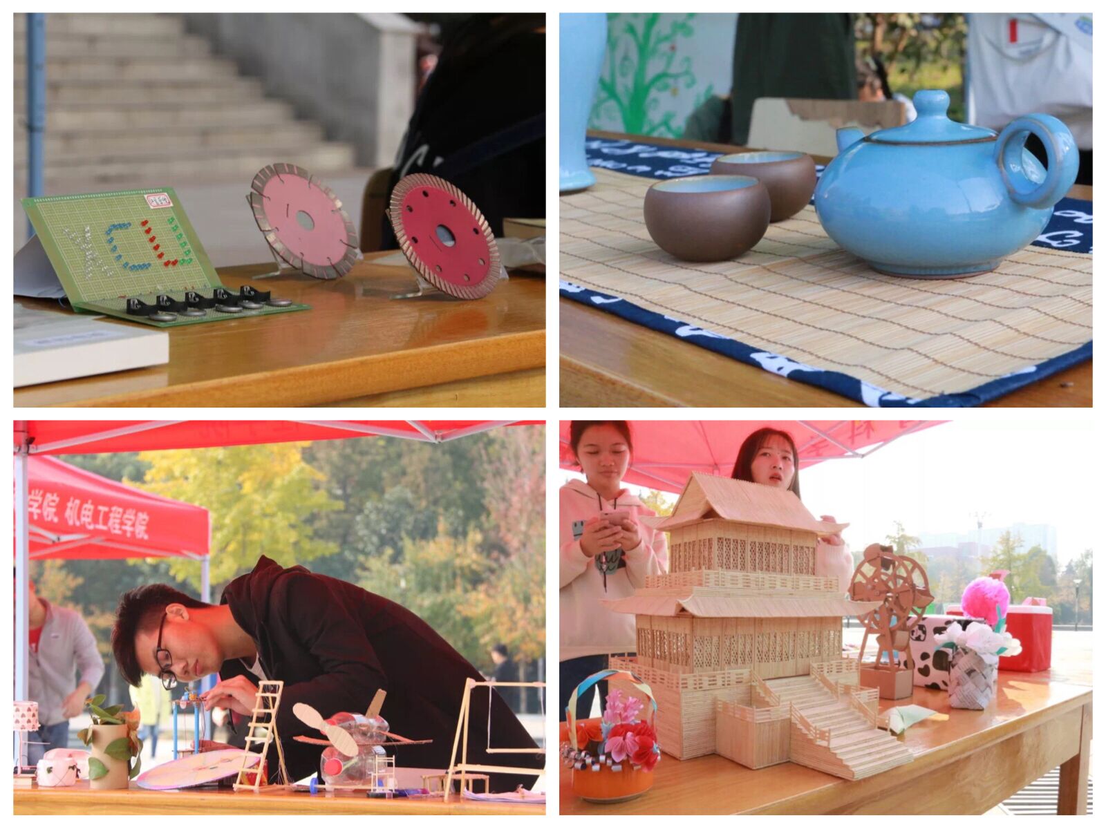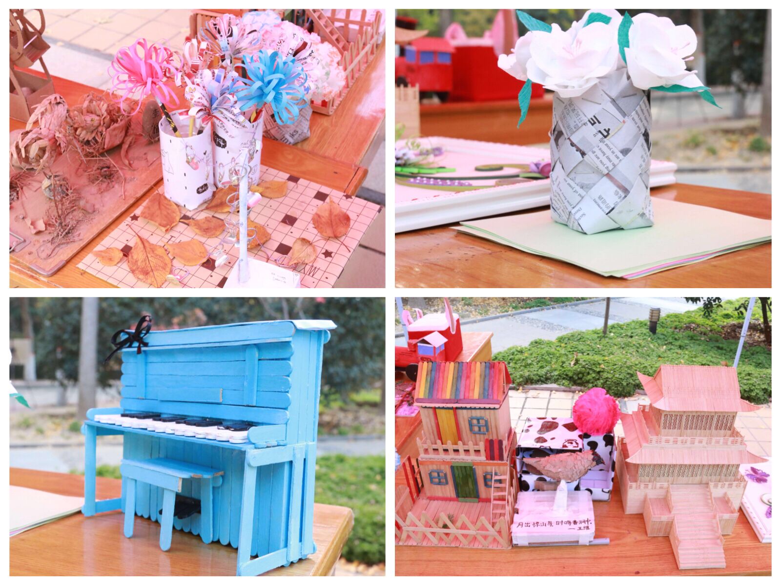 来自土木工程学院、城乡规划与园林学院和教育科学学院的同学们纷纷展示了自己的巧手妙思,废弃的纸板、塑料瓶、木棒、快递盒,在他们手中摇身变成了埃菲尔铁塔、飞机模型、秋千、钢琴、春秋楼等精美的工艺品,许院校园的纸板模型更是吸引大家纷纷驻足。