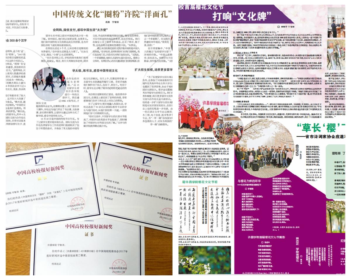 会上公布并评点了2017年度全国高校新闻获奖情况。我校党委宣传部(新闻中心、校报编辑部)报送的作品《中国传统文化“圈粉”许院“洋面孔”》《许昌学院报·樱花文化节专版》《纪念九·一八》分别荣获通讯类二等奖、版面类二等奖和新闻摄影三等奖。