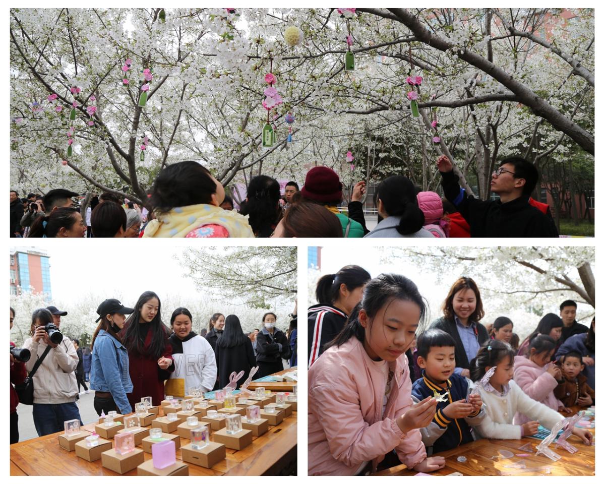 樱花树上,还挂着不少同学们自己动手制作的工艺品。樱花树下,有不同专业同学带来的樱花树脂、樱花扇面、樱花拼图、樱花发饰、钧瓷饰品、樱花摆件等,“把课堂上学的知识融入到樱花文化节的周边产品里,我特别自豪!”化学化工学院的李安琪说。