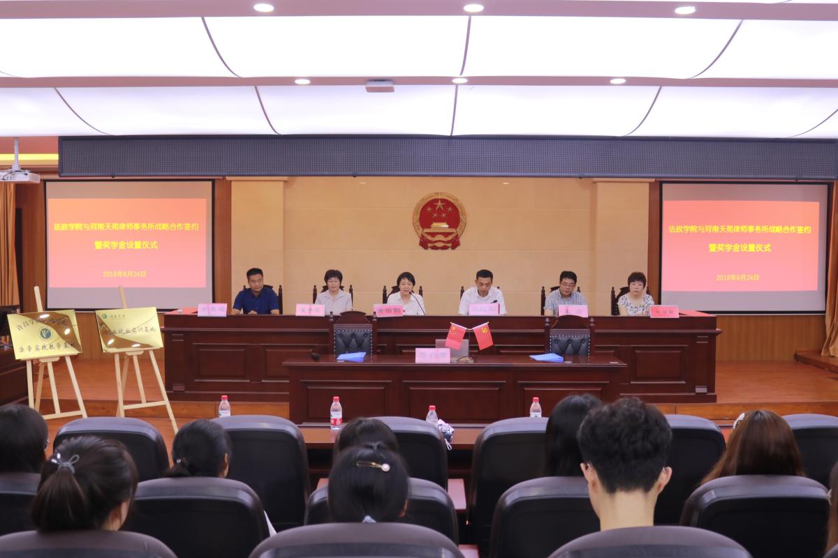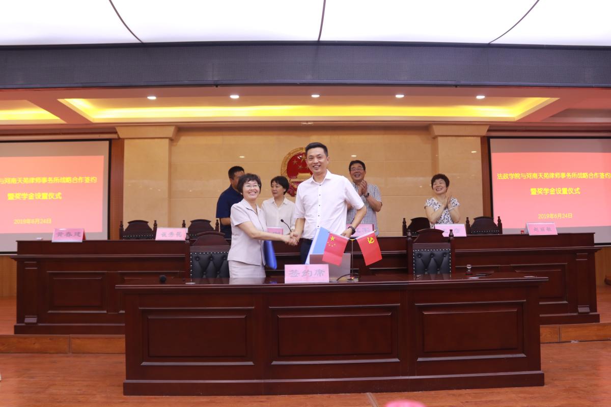 6月24日上午,我校法政学院与河南天苑律师事务所在C合二模拟法庭举行战略合作签约暨奖学金设置仪式。副院长黄怡俐、河南天苑律师事务所主任马红军出席会议,党委宣传部、法政学院等相关负责同志及法政学院全体师生参加了签约仪式。