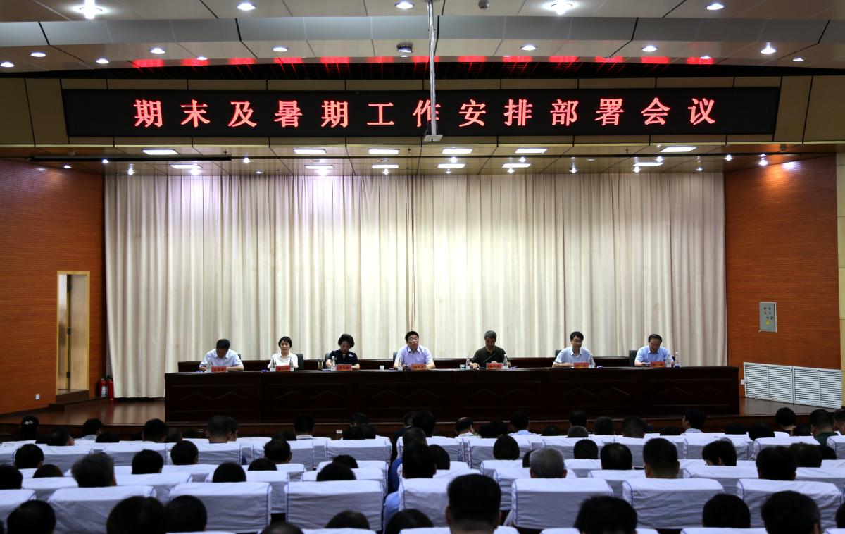 党委书记闫纪建在会上讲话。他强调,期末和暑假还有不少工作要按既定计划推进,大家要做到“三个做到,三个确保”:一是要做到压实责任,勇于担当,确保重点工作稳步推进。要扎实推进巡视整改工作,各有关单位要再次主动认领,切实承担起巡视整改落实的主体责任和第一责任人职责,攻坚克难,真抓实干,不拖后腿,高质量完成最后几项任务,确保整个巡视整改工作按照既定时间节点圆满完成。要进一步做好审核评估准备工作,要确保各类学习培训班圆满完成任务,要做好招生工作,要加快基建工程建设。二是要做到劳逸结合,张弛有度,确保假期过得充实愉快。大家要利用假期备课、写文章、论证项目,坚持学习。同时注意休息调整、养精蓄锐,形成一个良好的生活习惯。因公外出的要履行请假手续,因私外出时间较长的要报备,主要负责同志要保持通讯畅通。三是要做到警钟长鸣,防微杜渐,确保暑假期间安全稳定。要确保留校学生的安全,高度关注参加暑期社会实践学生的安全,要加强校区家属区的安全监管,抓好人防技防,做好说服教育和隐患排查。要加强值班工作的安排与督导,发现问题及时通报。