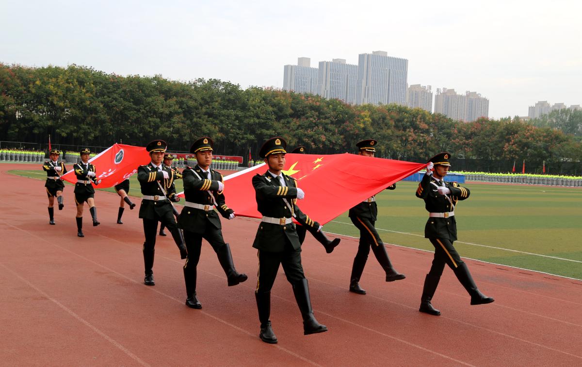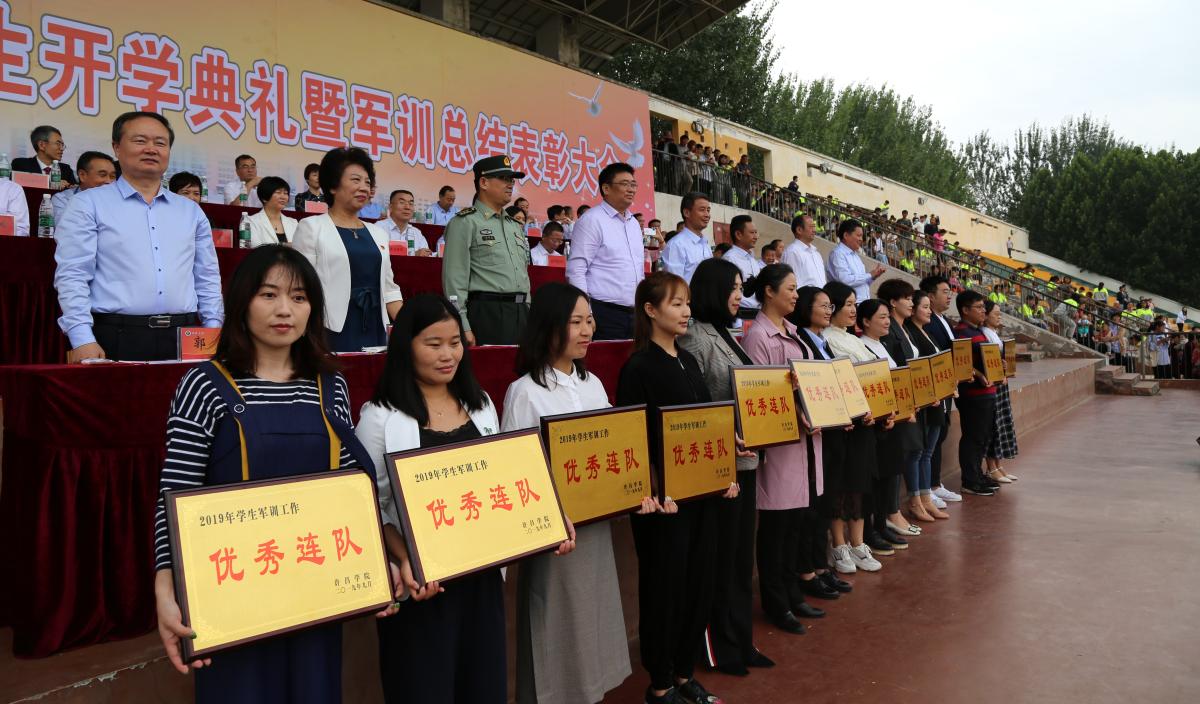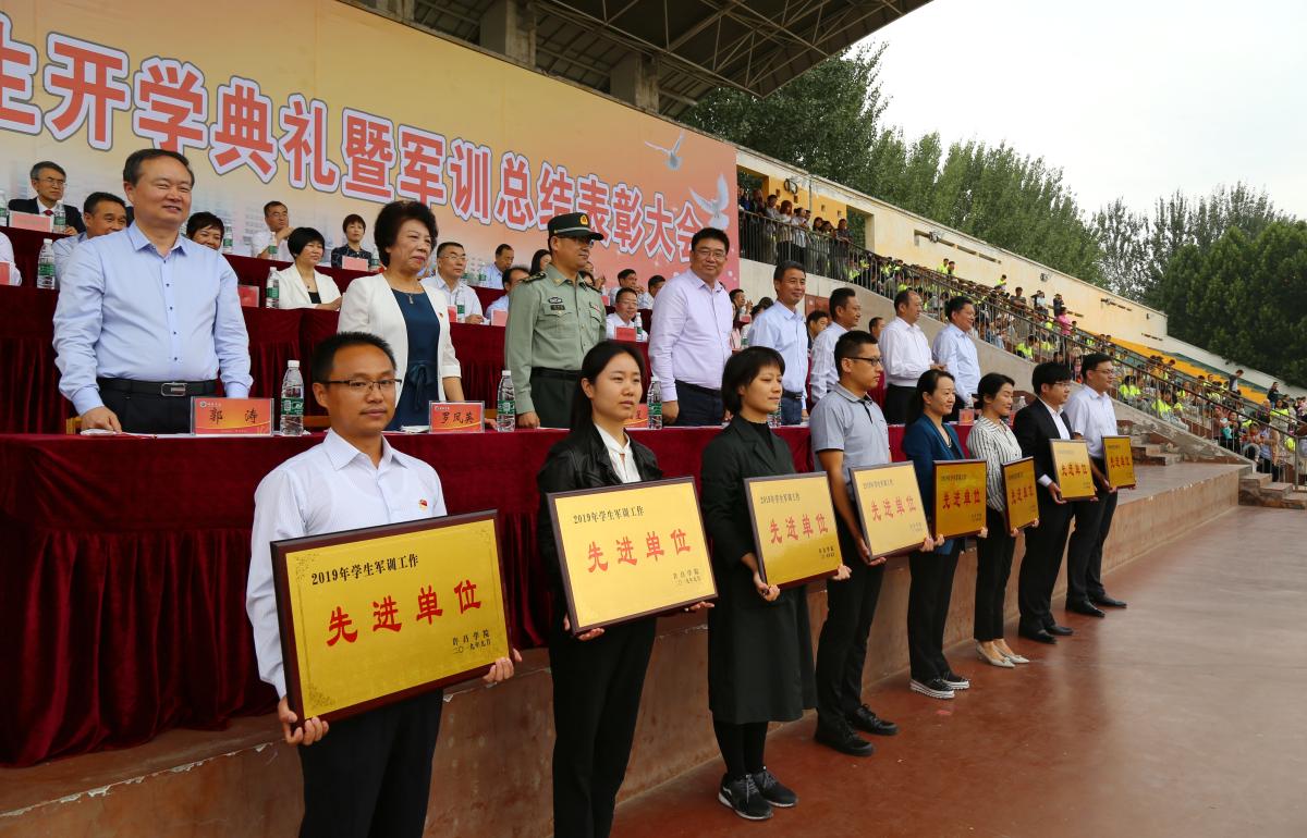 9月20日上午,我校在羽飞田径场举行2019级新生开学典礼暨军训总结表彰大会。党委书记闫纪建,院长岳修峰,党委副书记孙海,纪委书记罗凤英,副院长崔斌、郭涛,工会主席高金星,许昌军分区党委常委、战备建设处处长陈福星出席大会并在主席台就坐。学校机关各部门和二级学院负责人、各团总支负责人、辅导员(班主任)和全体2019级新生共同参加军训会操和开学典礼。仪式由党政办公室主任潘春彩主持。