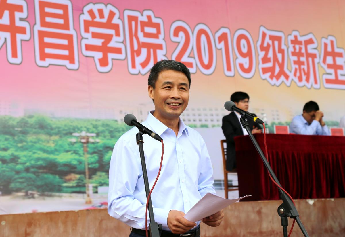 院长岳修峰在仪式上讲话。他代表学校向2019级新同学表示热烈的欢迎,向关心支持我校军训工作的许昌军分区首长和全体教官致以诚挚的敬意,对同学们圆满完成军训任务表示衷心的祝贺。