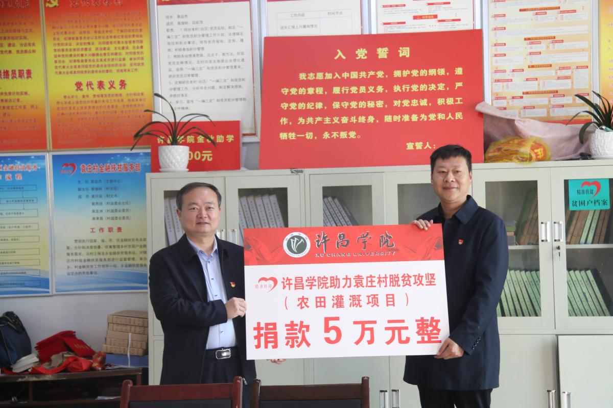 仪式上,副院长郭涛代表学校向袁庄村捐赠伍万元助力脱贫攻坚资金。他指出,许昌学院与袁庄村已结下深厚的友谊,接下来要争取更多好的项目在袁庄村落地开花结果,要利用好我校各项资源,特别是文化教育资源,扶贫扶志相结合,物质文明与精神文明相结合,把乡村的精神文明建设、文化建设抓起来,把农民的精神面貌展现出来。要抓好农村党建工作,聚心齐力,办好惠民实事,全力以赴做好袁庄村各项帮扶工作。