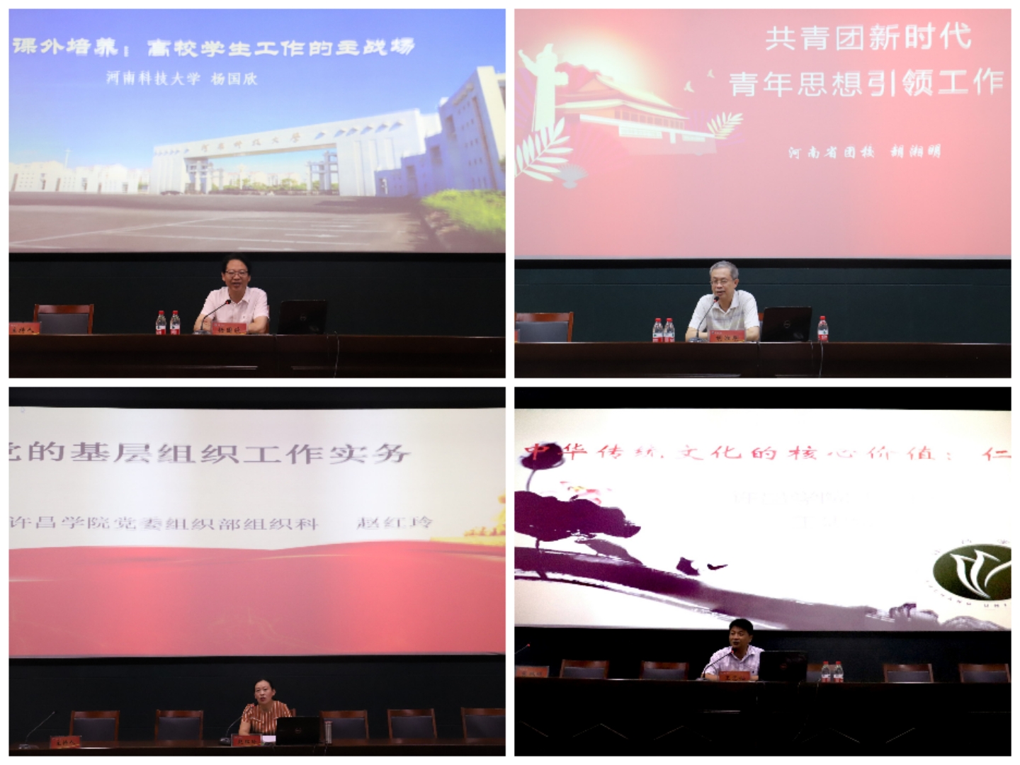 本次培训班根据《高等学校辅导员职业能力标准(暂行)》并结合许昌学院团学工作实际,邀请了河南科技大学教授杨国欣、河南团委信息科研中心主任胡湘明、许昌学院法学院副院长王忠灿和许昌学院党委组织部赵红玲等分别作专题讲座。培训围绕课外培养:高校学生工作的主战线、共青团思想引领工作、坚定文化自信和党的基层组织工作实务等四项内容进行了专题讲座和交流研讨。