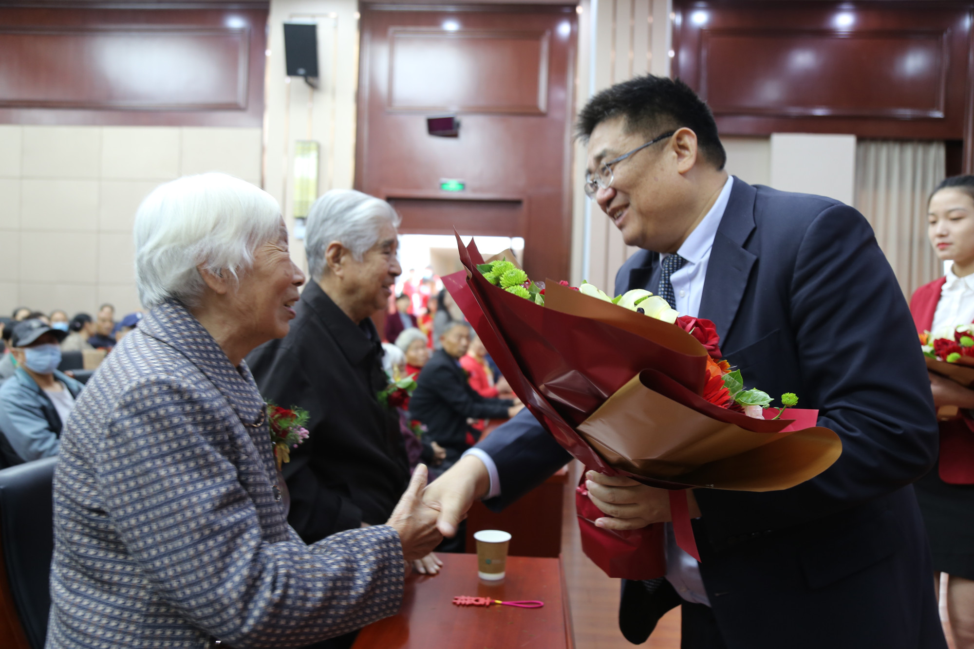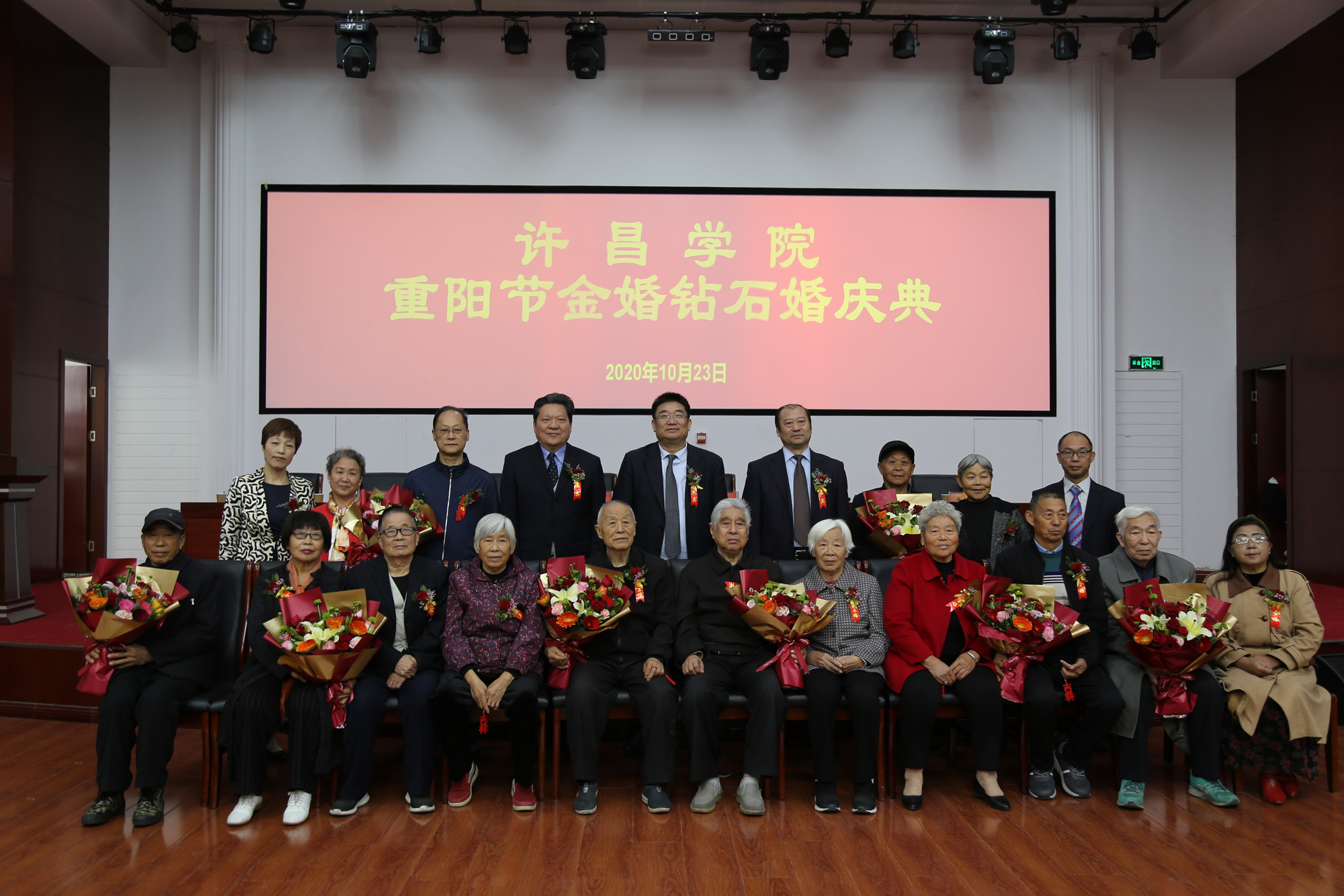 仪式上,离退休工作处党委书记唐红亮宣读了金婚、钻石婚伉俪名单,金婚钻石婚伉俪代表安枫灵发言,校领导向金婚、钻石婚伉俪敬献了鲜花并合影留念。(摄影:钟伟平)