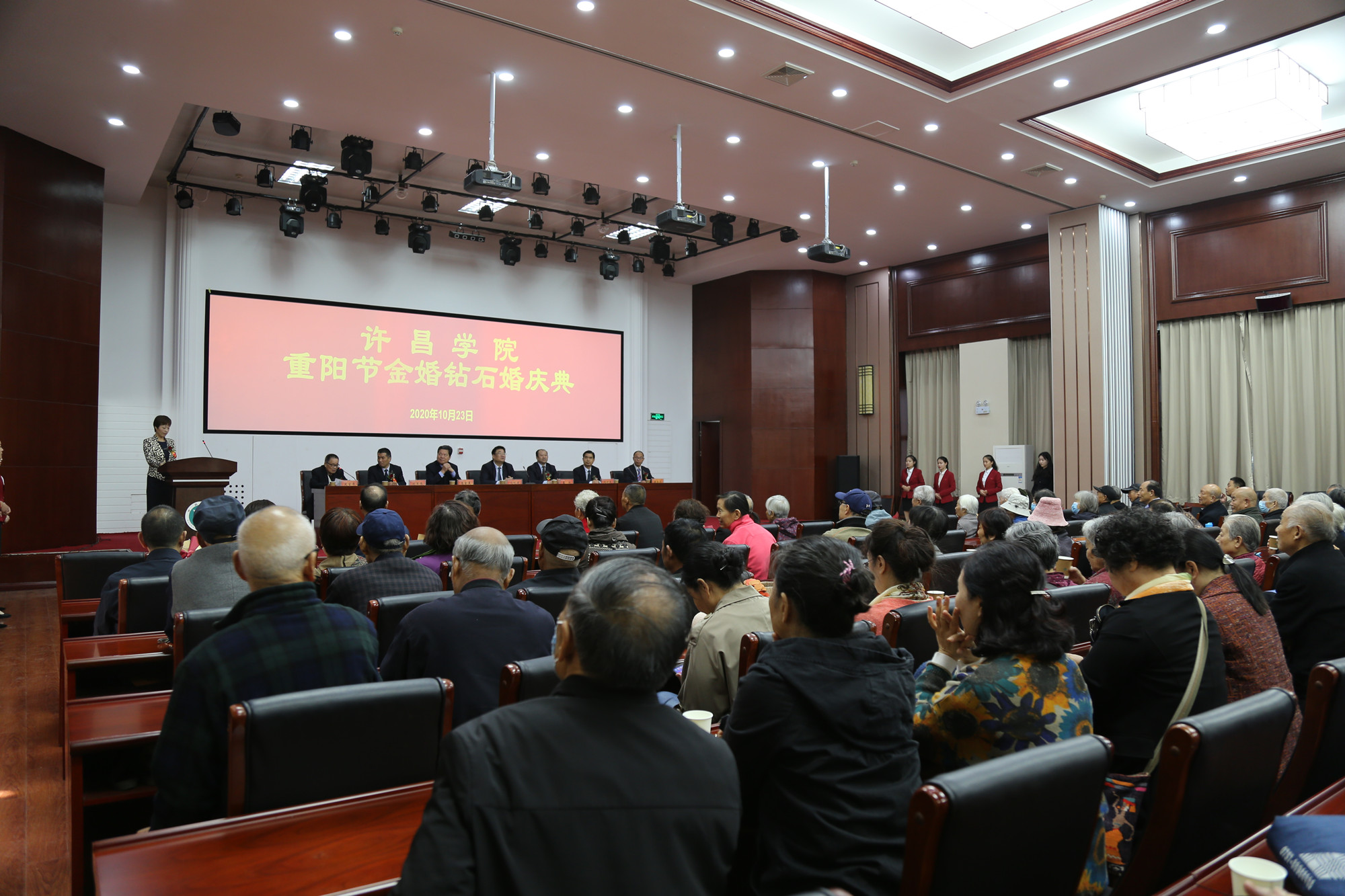 10月23日上午,创新创业中心一楼培训中心充满欢声笑语,我校200余名离退休老同志欢聚一堂。在这里,学校为9对金婚钻石婚伉俪举行庆典。校党委书记闫纪建,副院长崔斌、高金星出席,庆典仪式由离退休工作处处长翟惠婷主持。