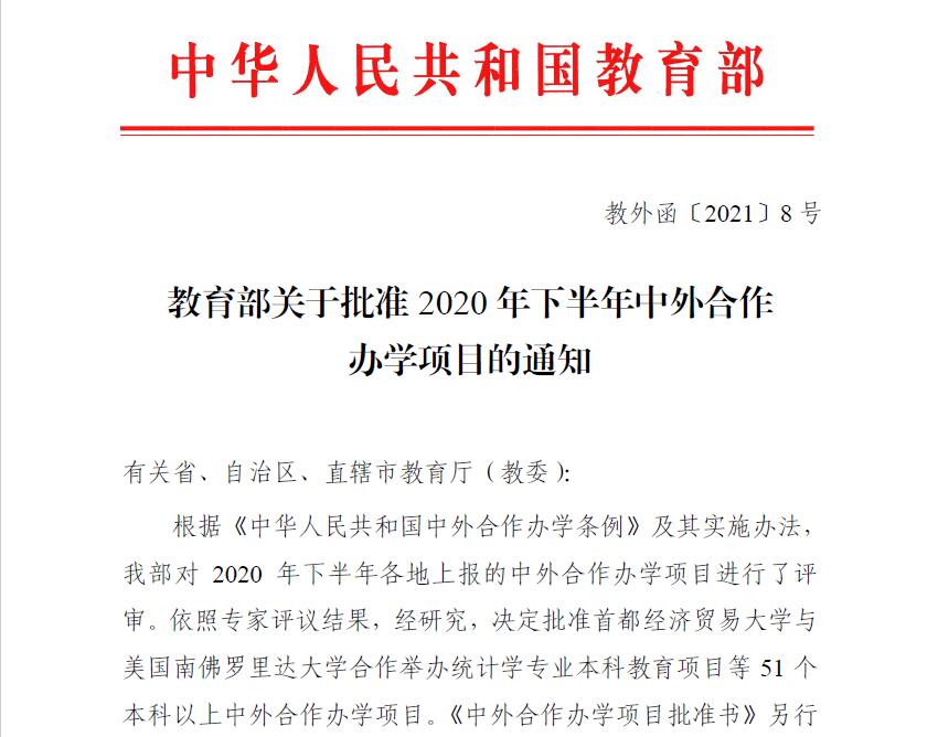 近日,教育部下发《关于批准2020年下半年中外合作办学项目的通知》,我校与美国贝尔维尤大学(Bellevue University)合作举办的数字媒体技术专业本科教育项目正式获批。该项目是我校继中美舞蹈专业、中加人力资源管理专业、中美土木工程专业三个本科教育项目获得教育部批准以来,第4个获批的教育部中外合作办学项目。