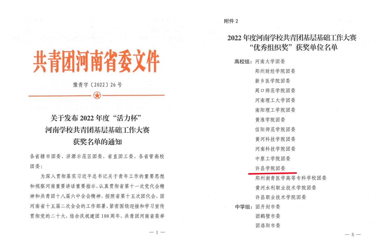近日,2022年度“活力杯”河南高校共青团基层基础工作大赛在郑州举办。我校在共青团工作项目、基层团干部微团课等比赛中再创佳绩,并荣获“优秀组织奖”。