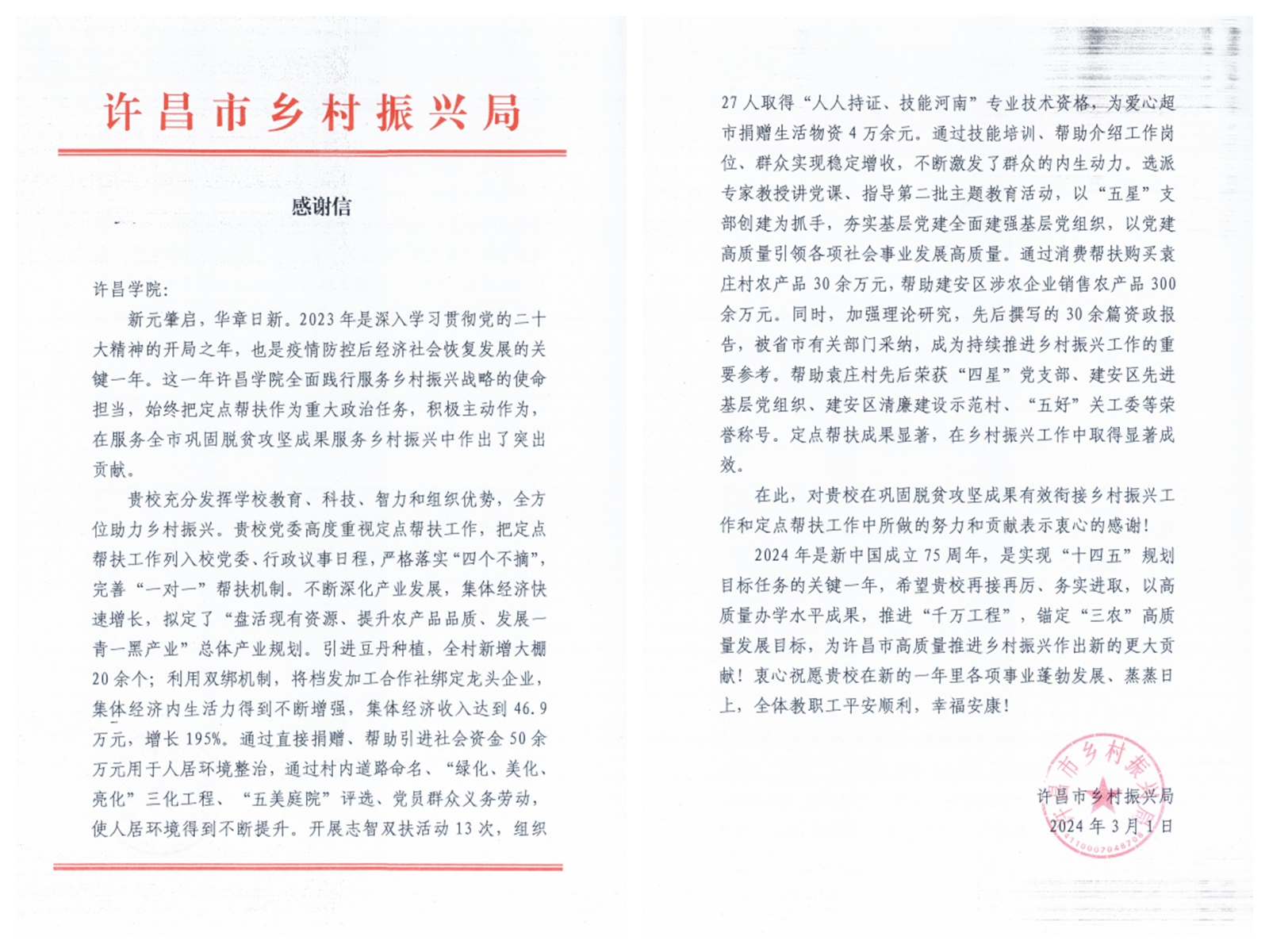 近日,许昌市乡村振兴局向我校致感谢信,对我校2023年发挥教育、科技、智力、人才和组织优势,在推动建安区袁庄村巩固拓展脱贫攻坚成果同乡村振兴有效衔接工作中所做出的努力和贡献表示衷心的感谢。