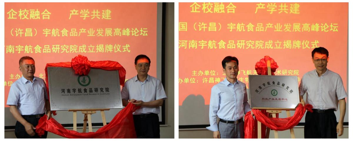 仪式上,中国航天科技集团有限公司航天育种研究中心总工程师曲建伟和许昌市政府副市长刘胜利共同为“河南省宇航食品研究院”揭牌,鄢陵县副县长赵峰和许昌学院副院长郑直共同为应邀“河南省宇航食品研究院科技发展中心”揭牌。(图片由食品与生物工程学院提供)