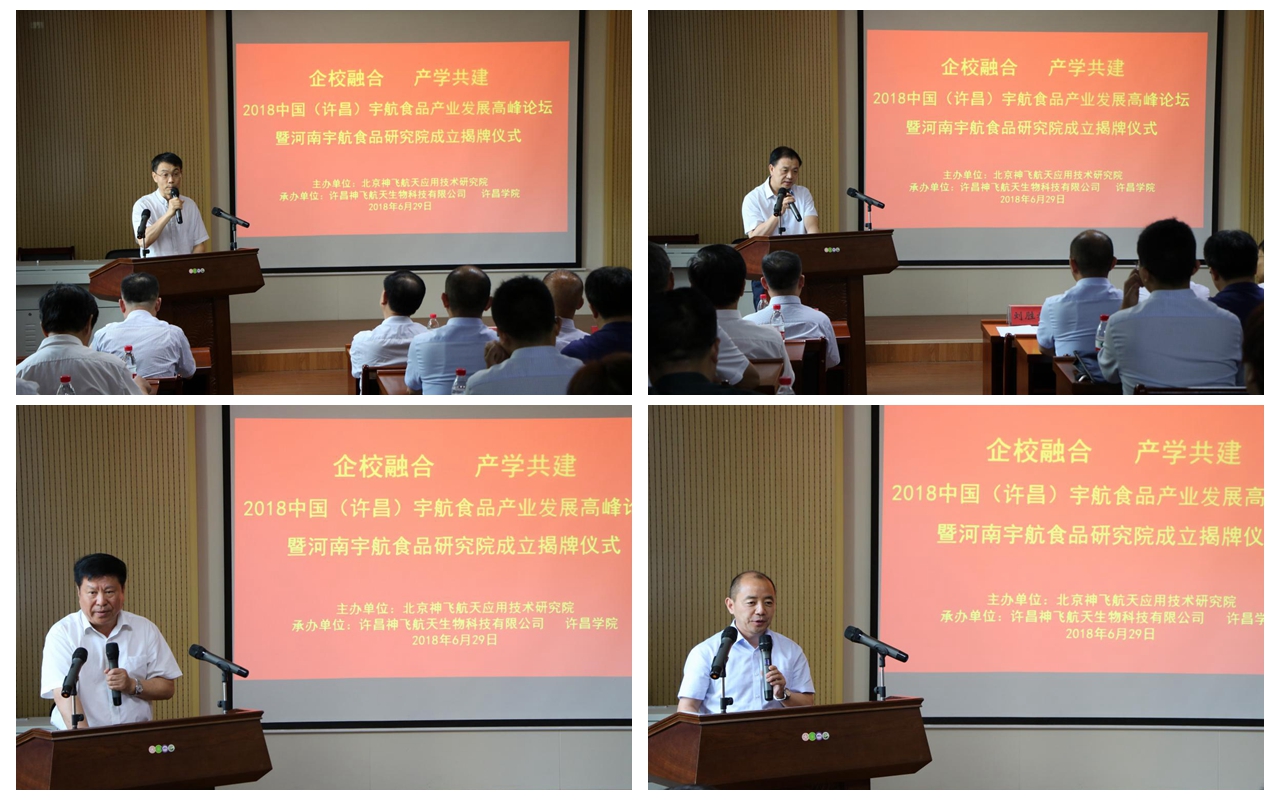 许昌市政府副市长刘胜利代表许昌市政府发表讲话。他指出,许昌作为郑州大都市区次中心城市,历史文化悠久,交通区位优越,生态环境优良,培育形成了包含生物医药在内的七大特色优势产业、四大战略性新兴产业。此次北京神飞航天应用技术研究院与许昌学院合作,成立河南宇航食品研究院,并在鄢陵建设中国宇航食品生产基地,是落实十九大精神的具体实践,双方通过校企合作、优势互补,以产业化的模式快速推进航天科技成果民用化,从源头到终端打造高效、安全绿色食品产业链,让更安全、更有营养的航天食品走进寻常百姓家。