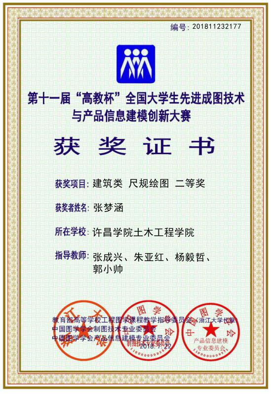 近日,第十一届“高教杯”全国大学生先进成图技术与产品信息建模创新大赛在南京工业大学落下帷幕。我校土木工程学院张成兴、朱亚红等老师指导的2名学生参加了本次比赛,其中张梦涵同学在建筑类尺规绘图单项竞赛中获得二等奖的好成绩。