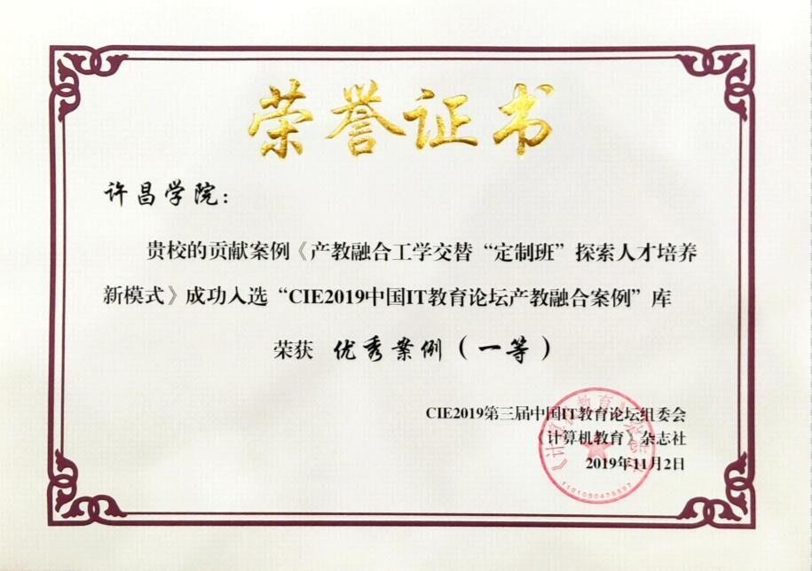 近日,我校信息工程学院提交的案例《产教融合 工学交替 “定制班”探索人才培养新模式》成功入选“CIE2019中国IT教育论坛产教融合案例”库,并荣获优秀案例一等奖,据悉,全国共有六家单位获得该奖项。