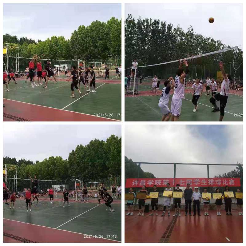 5月27日,我校第十七届学生排球比赛圆满结束。本次比赛历时9天。经过激烈的角逐,外国语学院、土木工程学院和文史与传媒学院位列女子组前三甲,教育学院、信息工程学院、电气与机械工程学院、国际教育学院和数理学院分获女子组第4至8名。国际教育学院、电气与机械工程学院和信息工程学院位列男子组前三甲,文史与传媒学院、数理学院、土木工程学院、教育学院和商学院分获男子组第4至8名。