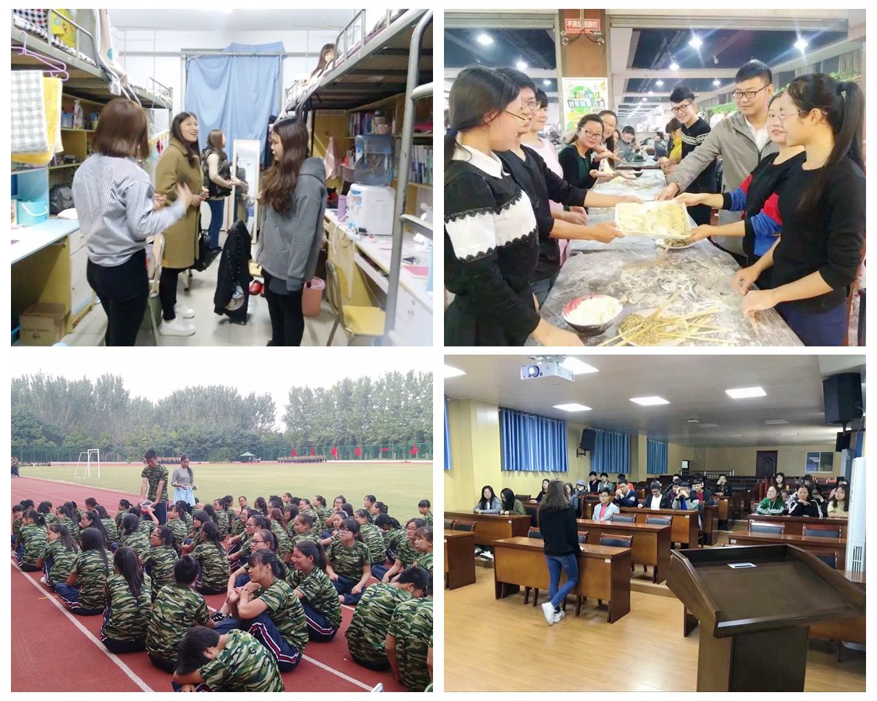 (左上:走访学生宿舍;右上:组织班级学生冬至包饺子;