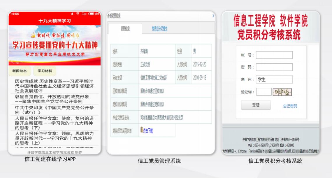 探索数字化党建,实现党建互联网+。通过构建“信工党建在线学习APP”“信工党员管理系统”“信工党员考核系统”三大平台,打造 “互联网+党建”新模式,初步实现了党员管理、党员学习、党员考核的全数字化。(图片由各总支提供)