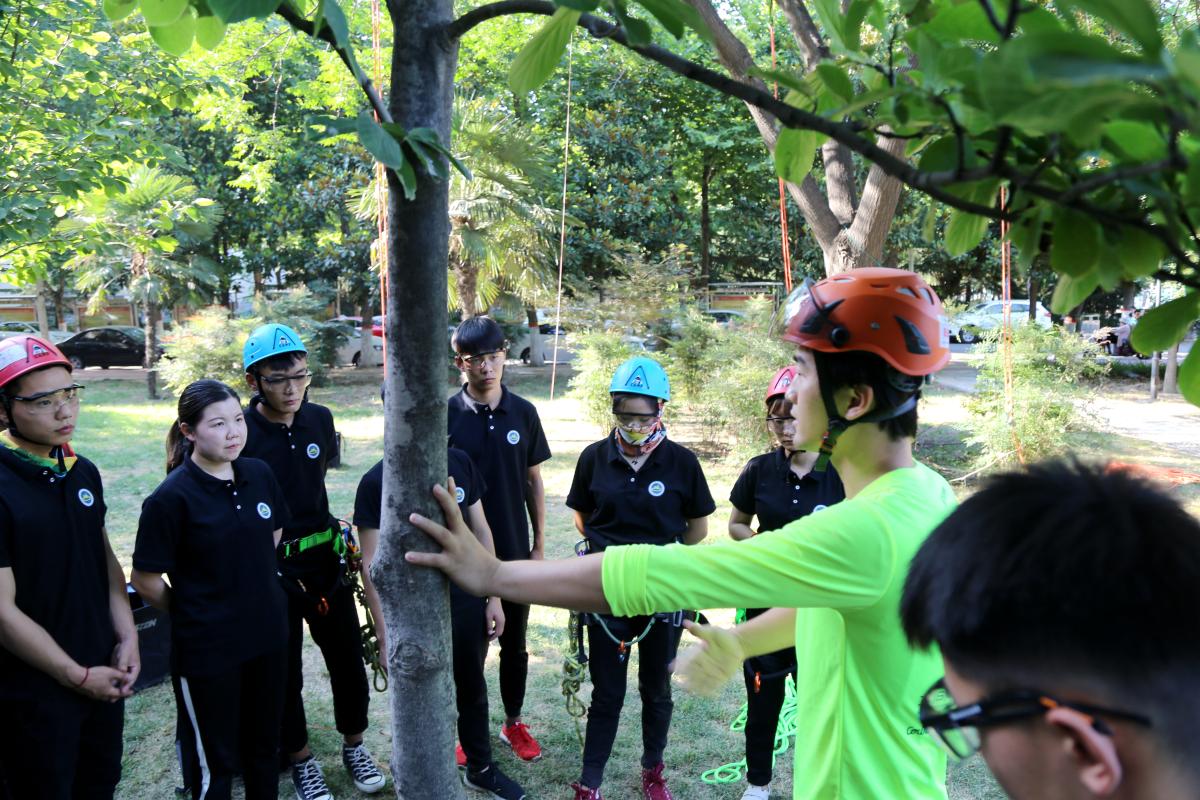仲夏六月,烈日炎炎。在学校办公楼东侧的苦楝树清凉树荫下,经常会有一群正在上攀树课的师生引人驻足侧目。他们在这棵层楼高的大树上挂了根绳子,地上整齐的放着绳索头盔安全带……没错,他们就是要爬到高高的——上课。